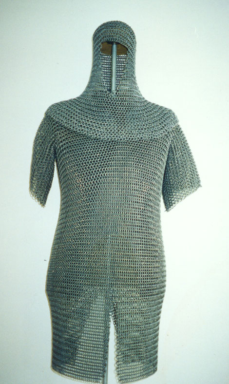 This is a maile hauberk and maile coif. It is made in a 4-in-1 pattern of butted rings. The individual rings are made of 14 gauge galvanized steel wire and are 3/8" in internal diameter. Overall weight is 34 pounds and approximately 3/8 of a mile of wire was used in the construction.